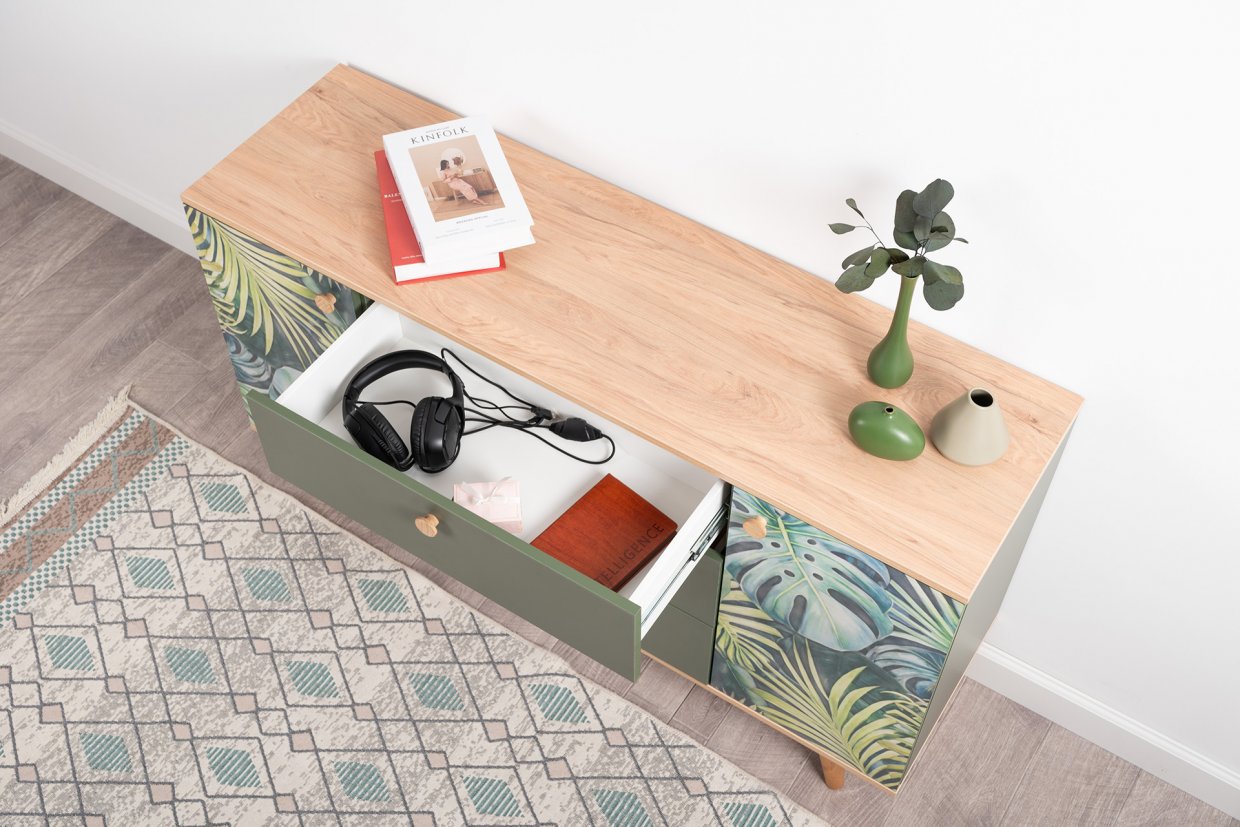 Маттиас – яркий комод с фотопечатью в тропическом стиле. Деревянные ручки и опоры подчеркивают естественность дизайна, а шариковые направляющие полного выдвижения и петли с доводчиком обеспечивают плавность и удобство эксплуатации.