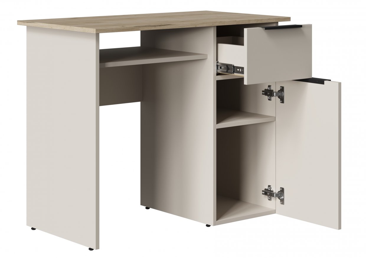 • Тумба с ящиком на шариковых направляющих (полное выдвижение, 400 мм) и отсеком со створкой.