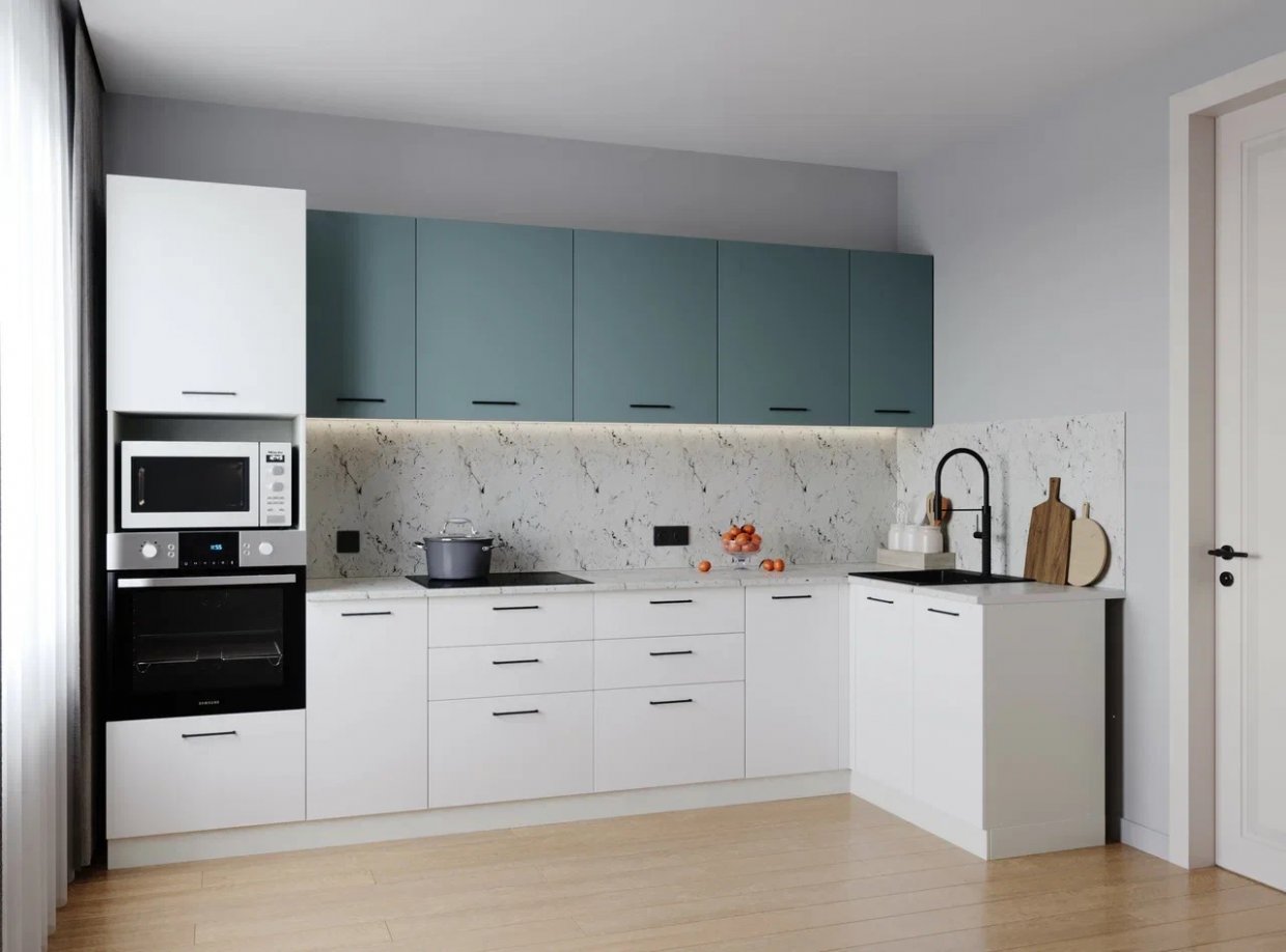 В стоимость не входит, раковина, смеситель, техника, фартук, плинтуса и закрывающий комплект (глухая панель нижнего бокового модуля. можно докупить отдельно)